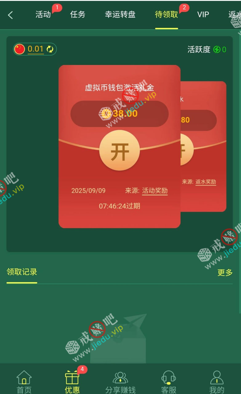 38打码3水,再去申请38,可以提了再去领那个38,领取方式,优惠→钱包→自助申请即可。