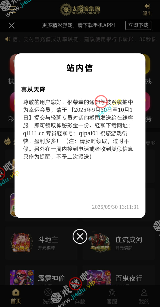 站内信有信息的直接截图发给客服,领取神秘彩金,送的我8,我没充值过老用户去 兄弟们也可以去看看一下 。