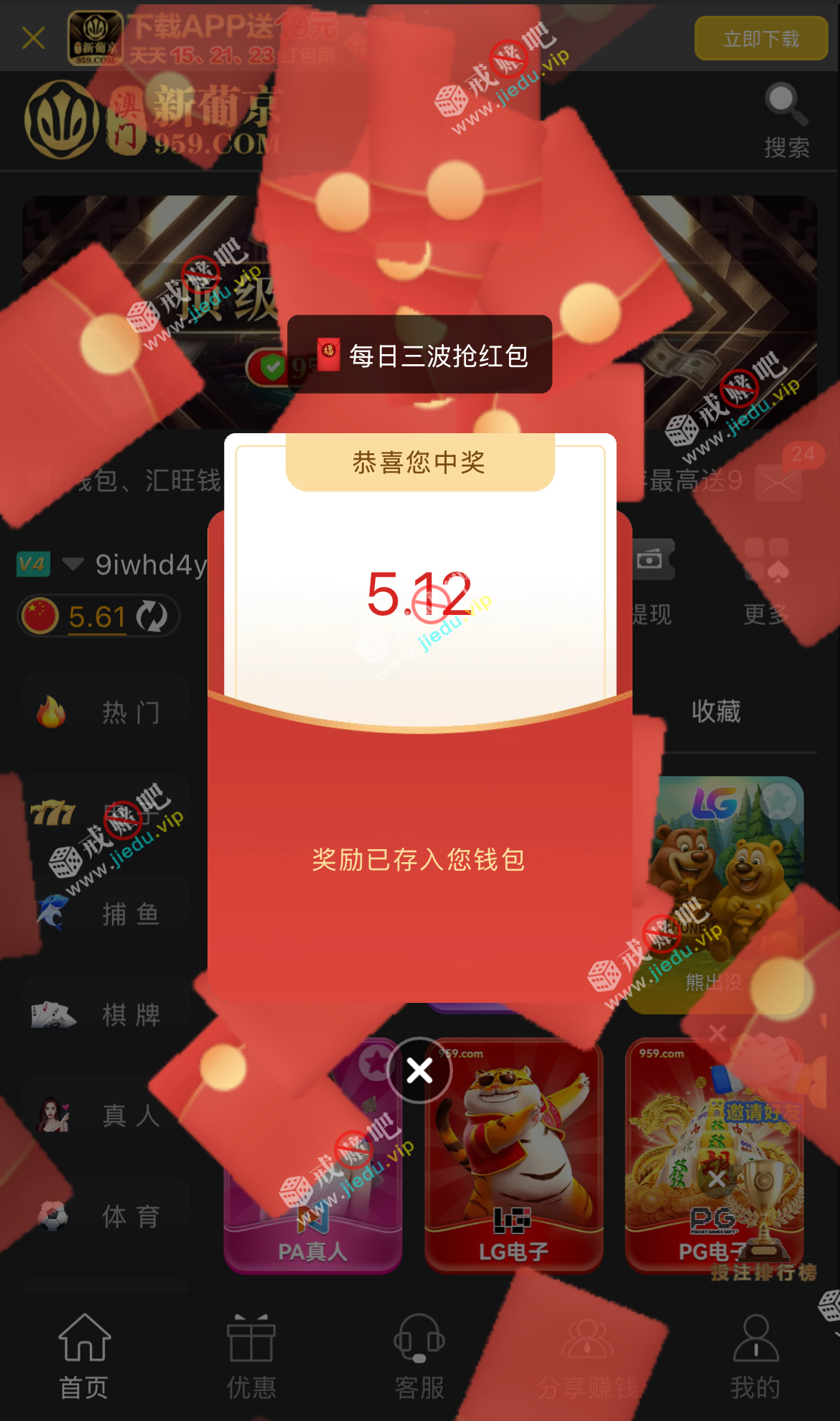 每天有三次抢红包的机会,看运气吧,还看活跃度,我号有五个,每天都能抽到一个比较大额的,然后再玩pg打出来。