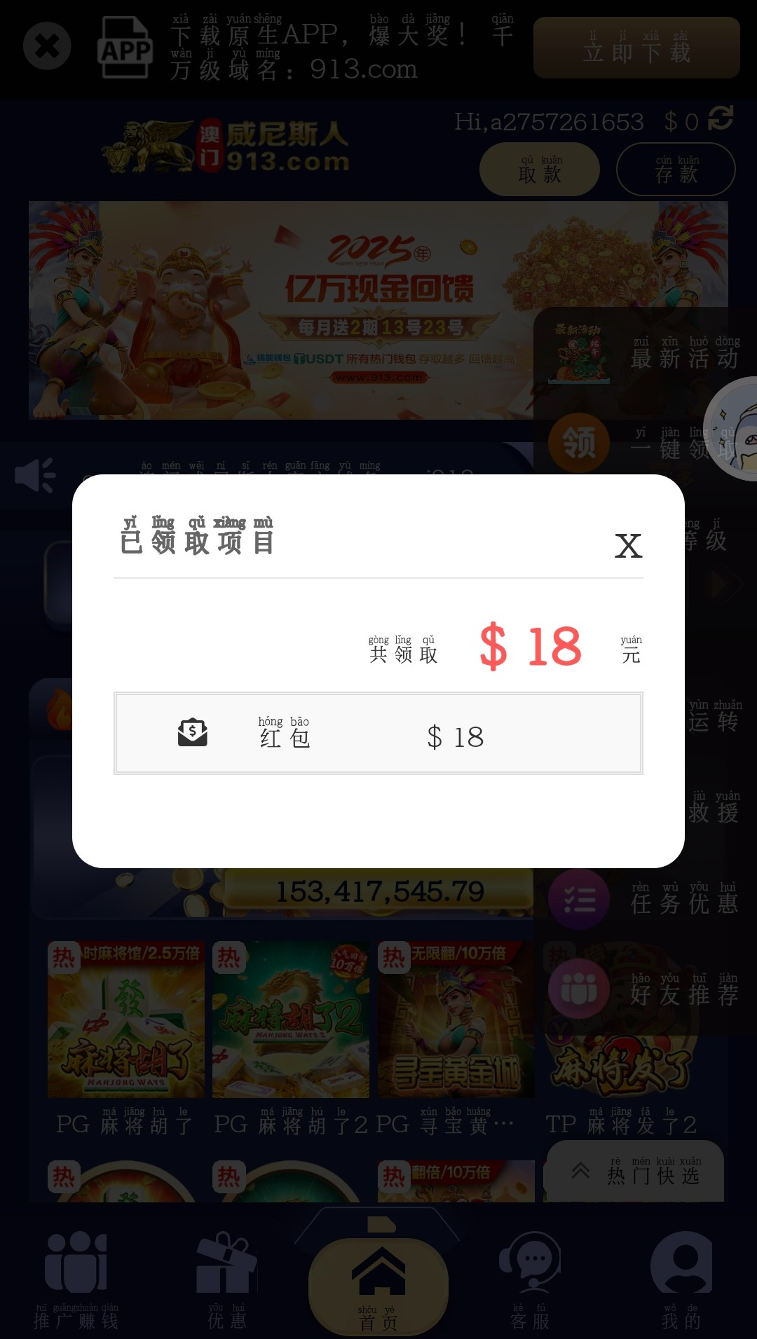 电话来说注册自动到账彩金,我是老号登录也有,没充值过