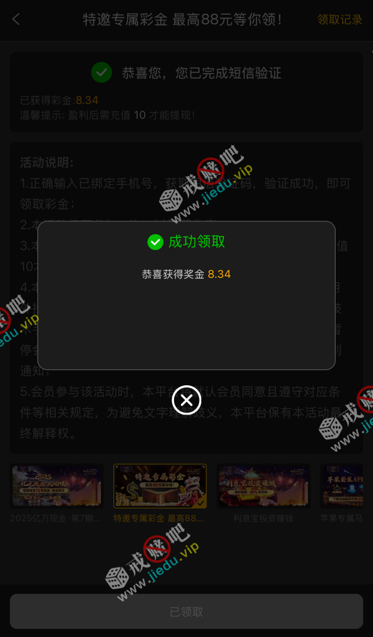特邀领取彩金的,你们可以去试试,活动里面有,输入手机号验证,碰瓷看看。