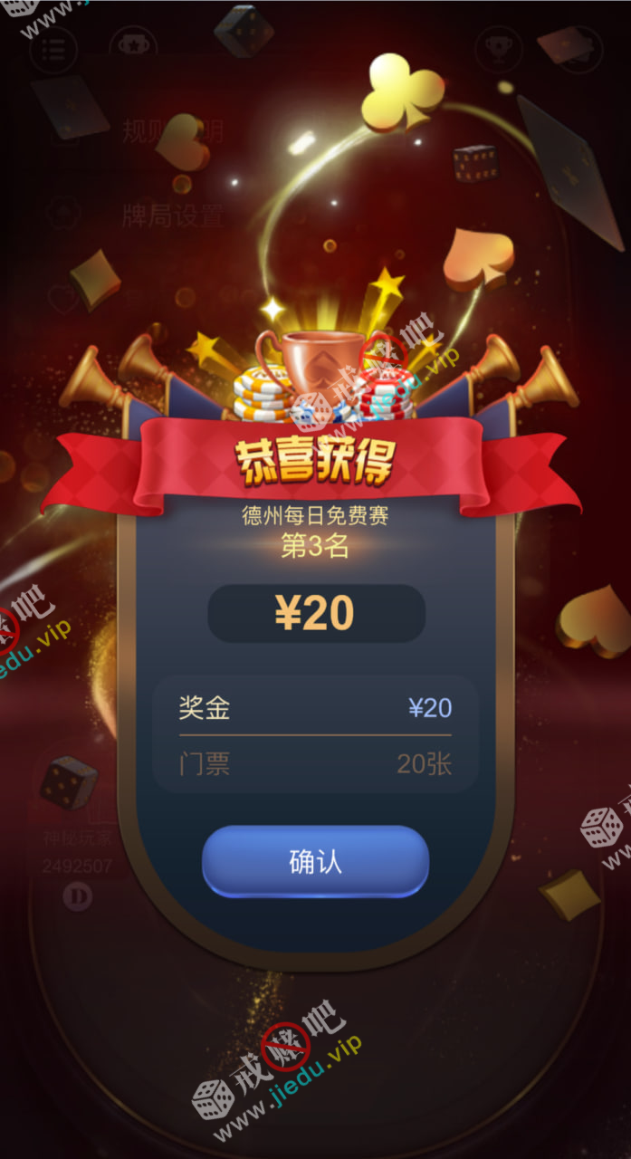天天每半个小时都可以打扑克免费赛打上排名送彩金和门票,还有收到短信就会送68 的彩金,去碰碰吧。