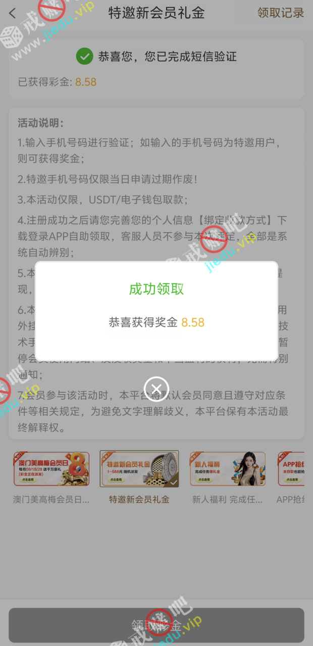 特邀彩金,金额随机,我只领到 8.58,没收到短信和电话的哥们,输入手机号碰瓷试试。