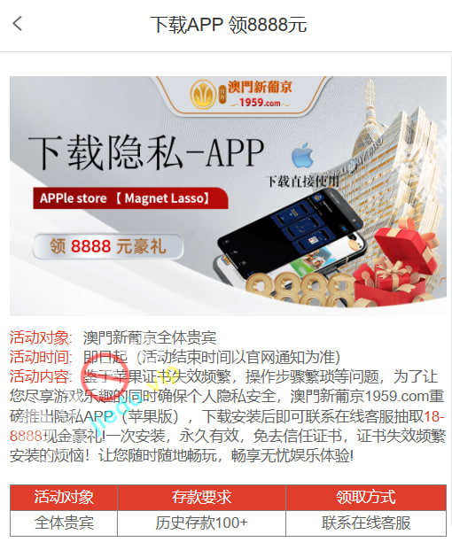 历史充过100的哥们,仅苹果哦,下载就送 18 的彩金。联系客服领取。