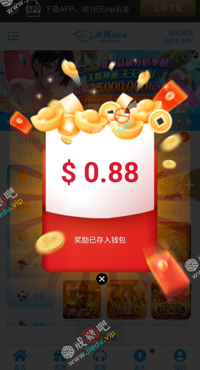 充值过的每天可以抢红包,红包4波,抢的时候整点抢,0.88几率很大,昨天中了 2 次今天中一次,哥们别错过了!