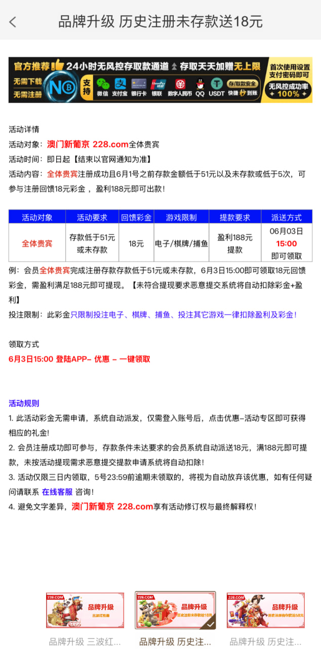 6.1号之前注册未充值的送18 充值5次大于51的送58 还有单笔充值彩金 有号的兄弟们上号自己看活动 6.3号下午15.00和16.00彩金优惠领取即可