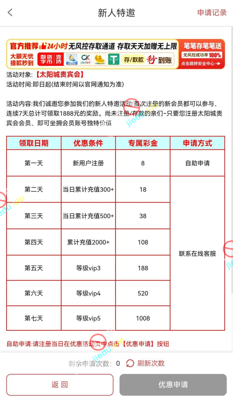 注册绑卡后点击优惠自助申请,我已碰到。
