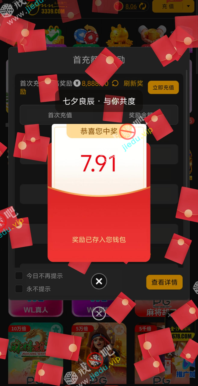 有在永利充值过的上号抢七夕红包了,我领到了 7 块多,吃上了 100。