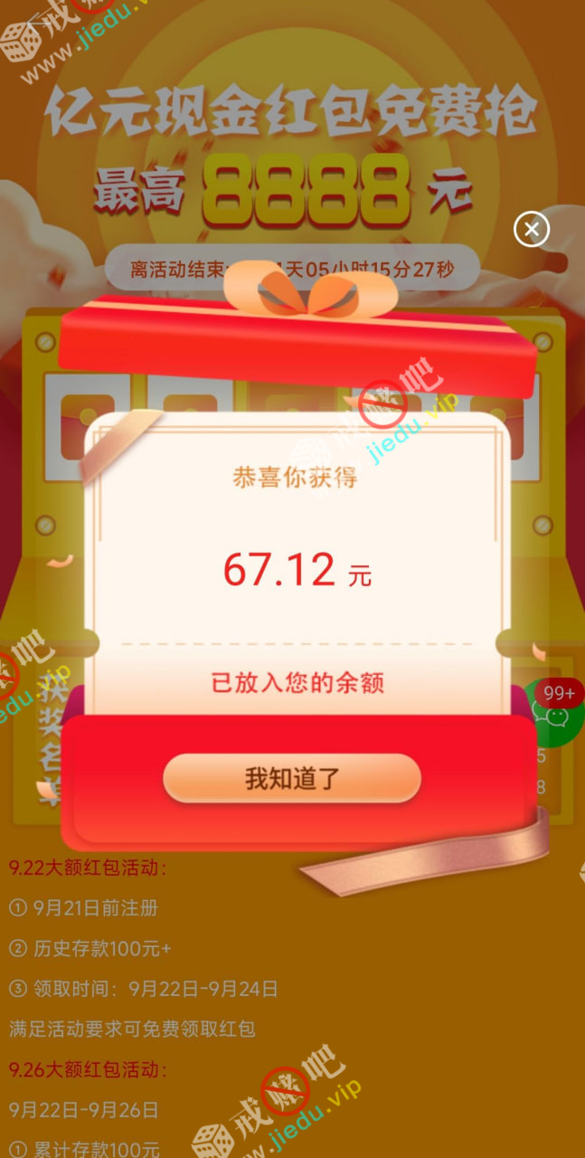 9月21日前注册,历史存款100元+,领取时间:9月22日-9月24日,满足活动要求可免费领取红包!